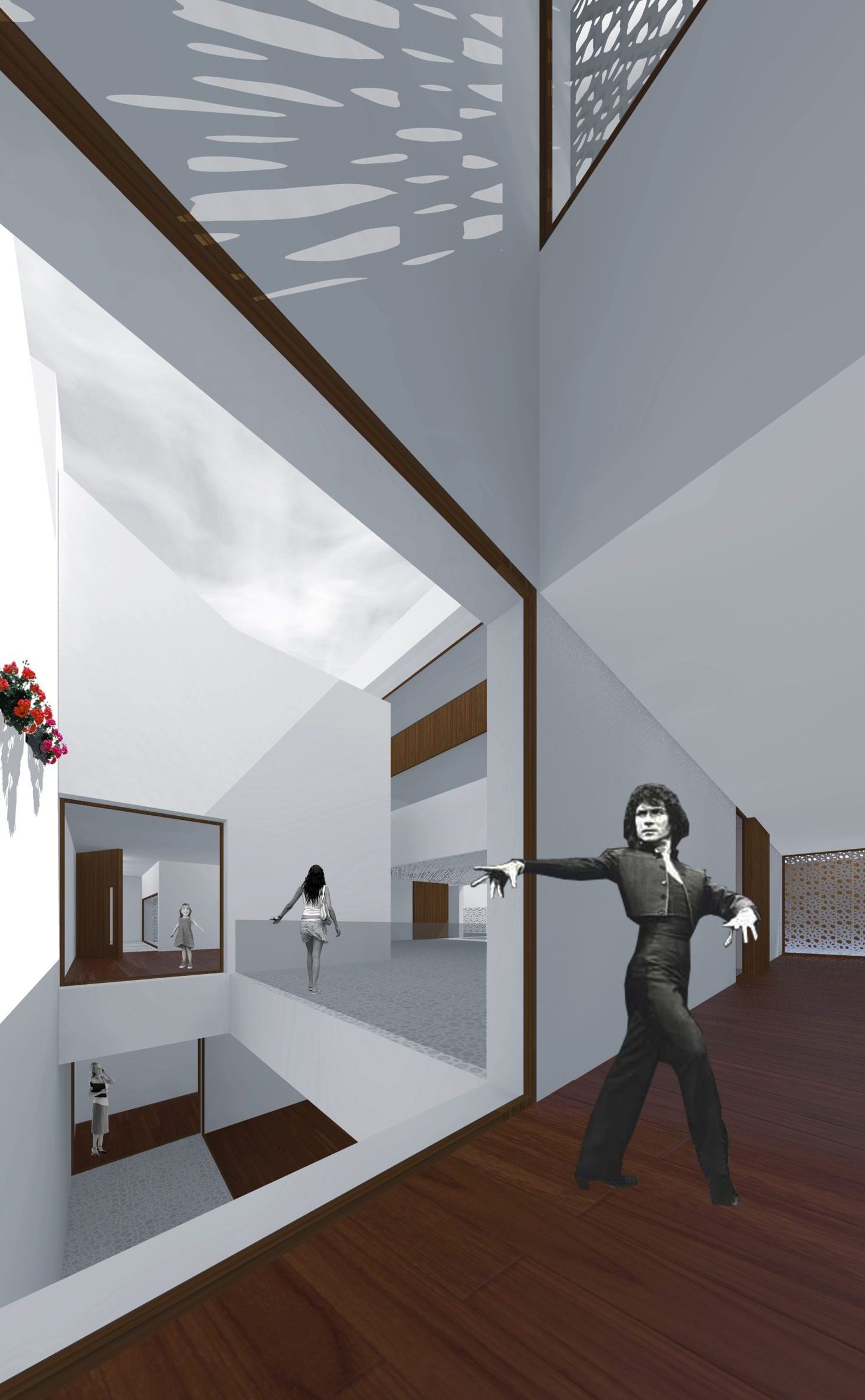 Esta propuesta, presentada a concurso, buscaba integrarse en el tejido urbano respetando su ritmo y proporciones. La volumetría se organizaba en torno a un patio central inspirado en la Córdoba histórica, conectando espacios abiertos y cerrados mediante celosías que optimizaban la iluminación natural.