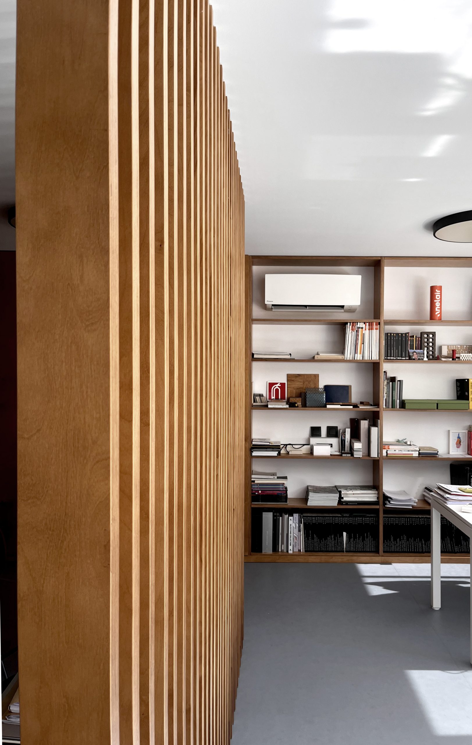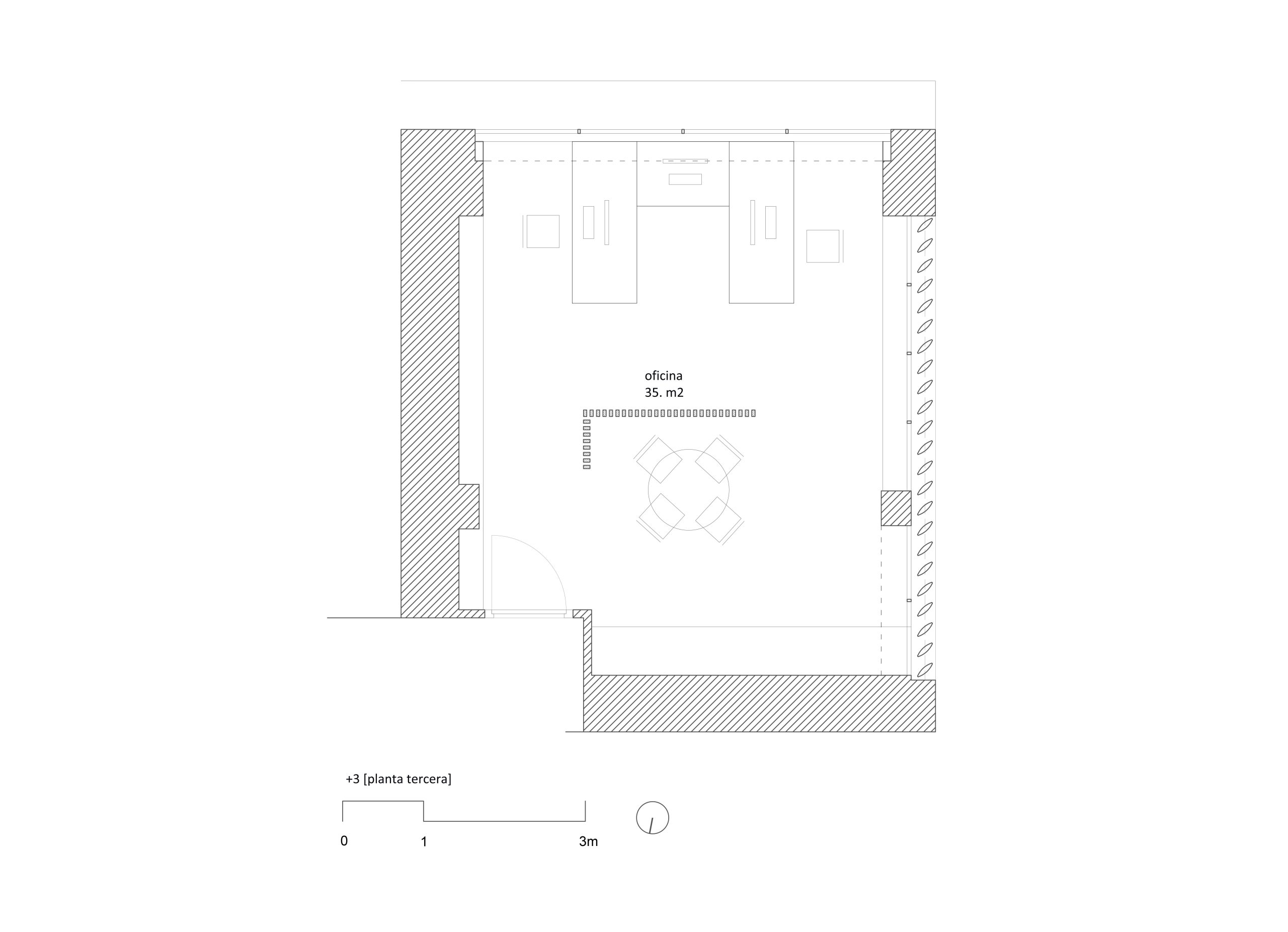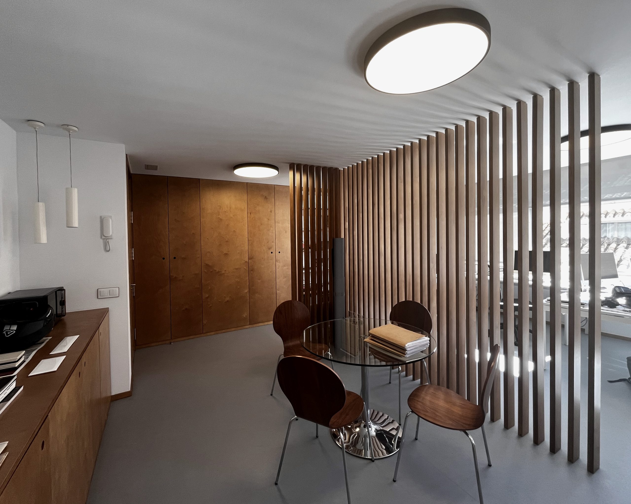 El proyecto convierte un estudio obsoleto en un espacio amplio y luminoso, eliminando divisiones marcadas y empleando tonos suaves. Una celosía de madera actúa como filtro visual, mientras que los espacios intersticiales entre pilares y patinillos, ocultos con paneles de madera, destinados a almacenamiento. Como resultado, se logra una planta diáfana con mesas organizadas y áreas de almacenamiento integradas.