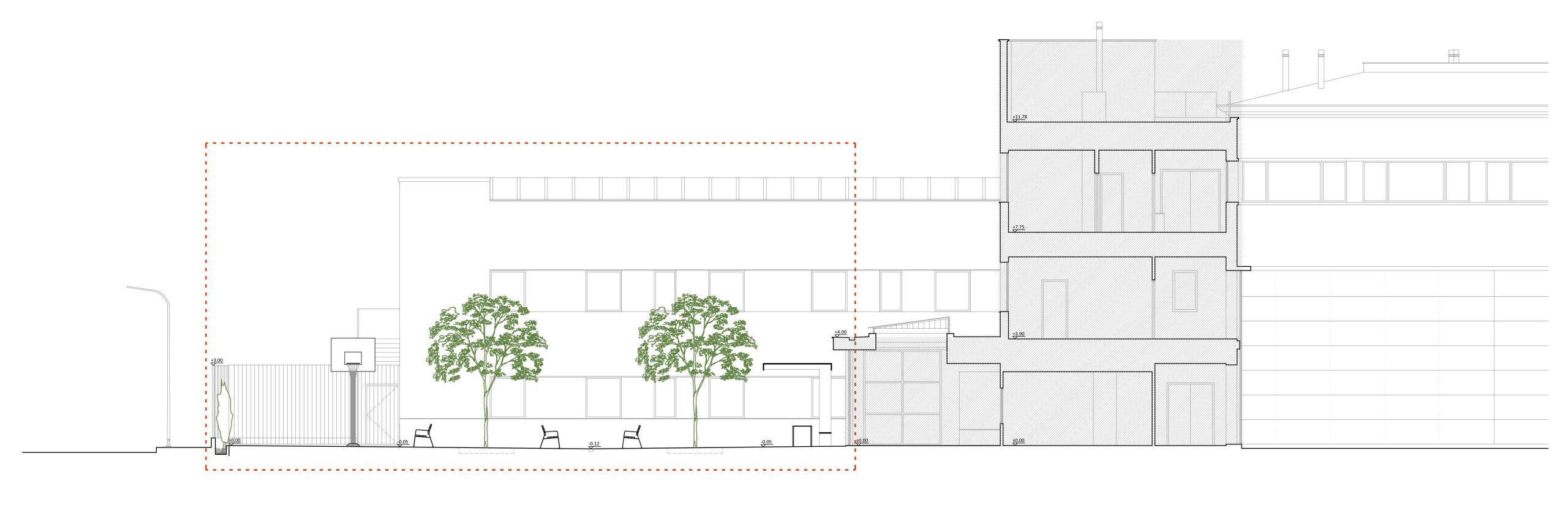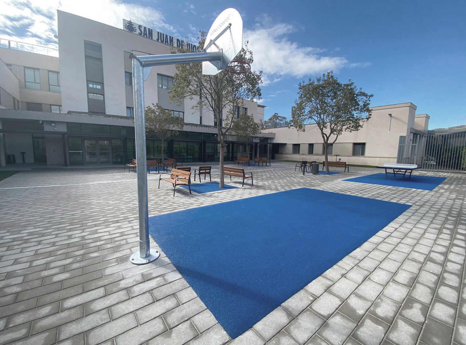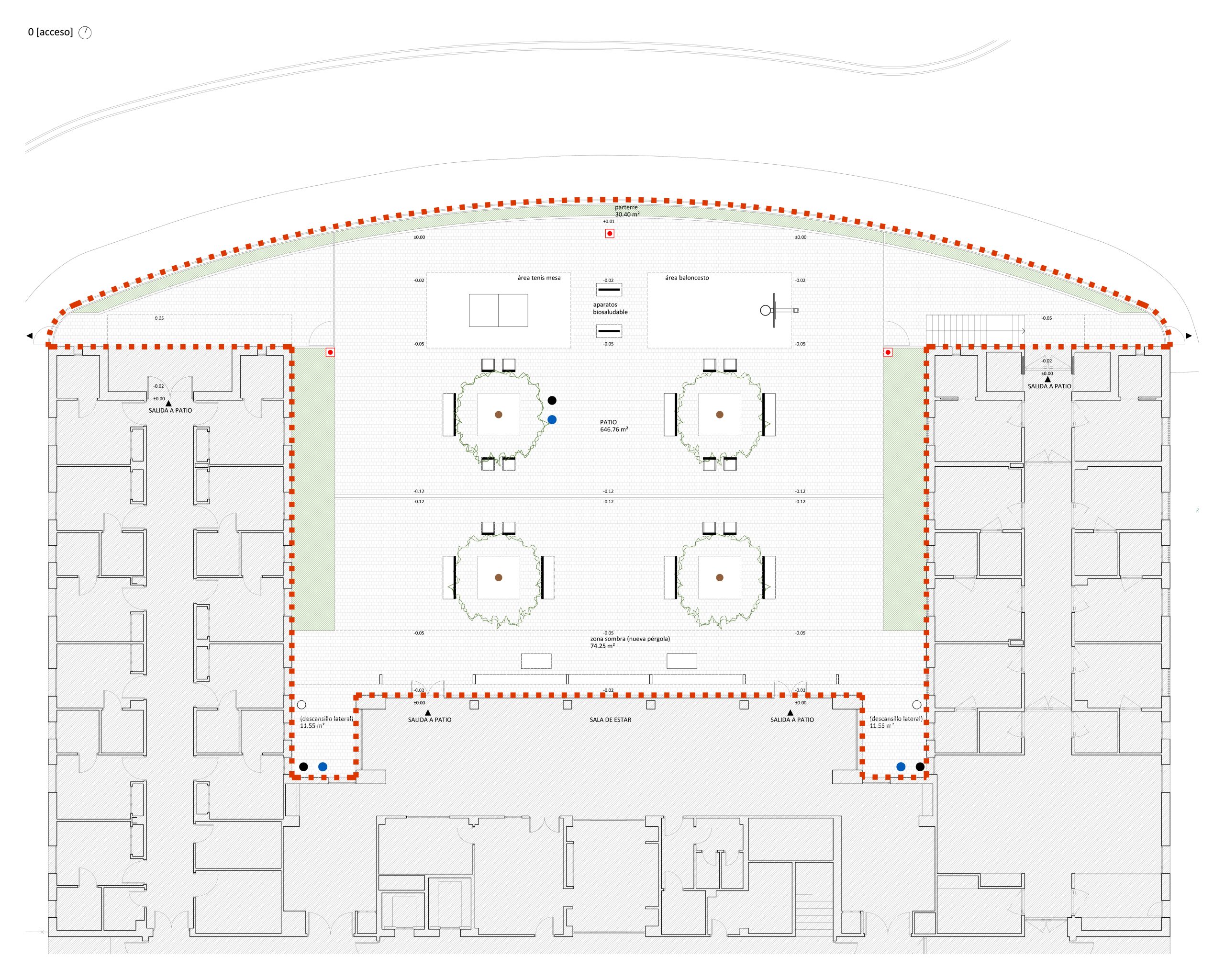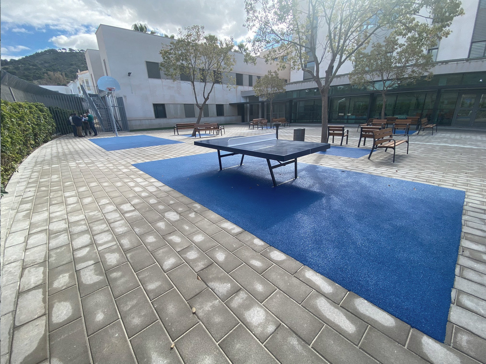 El proyecto corrige los desniveles generados por el deterioro del suelo, mejorando su estabilidad con columnas tipo mixed y una nueva solera. Además, se incorpora equipamiento funcional, como mesa de ping-pong, cancha de baloncesto y máquinas de movilidad, para adecuar el espacio a las necesidades de los usuarios.